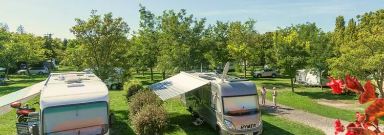 Größe und Charakter: 1,8 ha ebenes Grasland, Bäume, 58 teils gekieste Stellplätze (70–100 qm), 40 Dauercamper, 10 Mietobjekte.